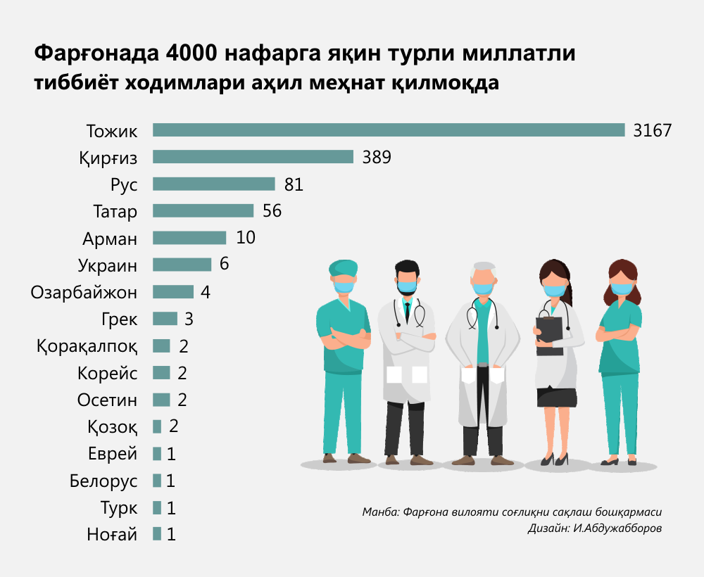 - Педитрия бўлимимизда турли миллатли шифокорлар ишлайди. Ўзим тожик миллатли врачман. Клара Ким биз билан бирга 20 йилдан бери ишлаб келмоқда. Бизга устозлик қилади. Бу инсондан мен кўп билмаганларимни ўргандим. Шифохонамизда турли тадбирлар бўлади. Унга ўзлари бош-қош бўлиб, доим бизга ёрдам бериб келади.